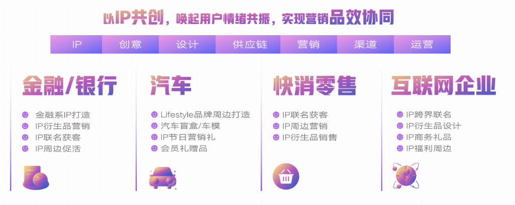 在“为美好生活造物”的理念逐渐成为营销趋势的背景下,乾昇控股敏锐地捕捉到了IP孵化与全案运营相结合的商业机会。公司大力拓展IP孵化设计、IP衍生品应用以及IP运营/跨界营销等业务,借助“IP+科技”的模式,在金融、汽车、互联网、快消、零售等多个领域快速渗透,为企业客户提供全方位的营销服务。